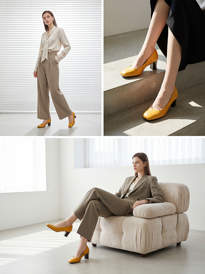 세련된 머스터드 컬러의 미들힐 펌프스입니다.